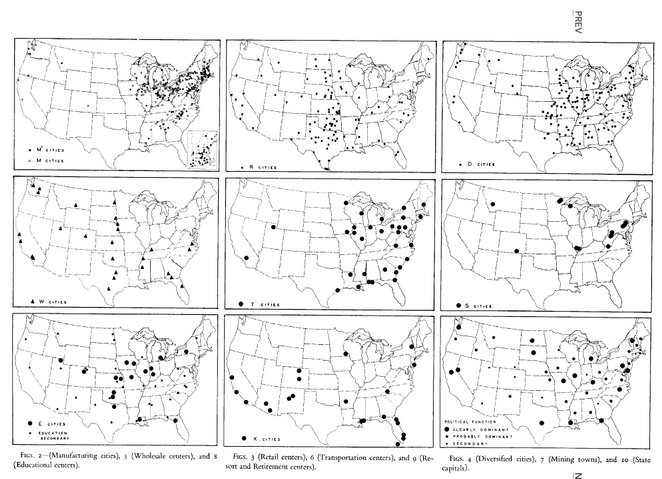 自上而下分別為,美國⑴制造業(yè)城市⑵批發(fā)中心城市⑶教育中心城市⑷零售中心城市⑸交通樞紐城市(鐵路和港口)⑹退休和度假勝地⑺“多功能”城市(貿易與制造業(yè)同等發(fā)展,但皆非占據主要地位)⑻礦產城市⑼州首府的分布情況。
