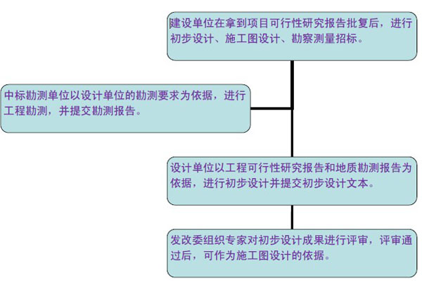 工程設(shè)計(jì)主要包括初步設(shè)計(jì)和施工圖設(shè)計(jì)。對(duì)于技術(shù)上復(fù)雜,又缺乏經(jīng)驗(yàn)的項(xiàng)目,可以在初步設(shè)計(jì)和施工圖設(shè)計(jì)兩個(gè)階段間增加技術(shù)設(shè)計(jì)。對(duì)于小型并技術(shù)簡(jiǎn)單的道路工程,經(jīng)有關(guān)部門(mén)同意后,可以利用方案設(shè)計(jì)代替初步設(shè)計(jì),按方案設(shè)計(jì)審批后直接轉(zhuǎn)入施工圖設(shè)計(jì)。典型的流程圖如下: