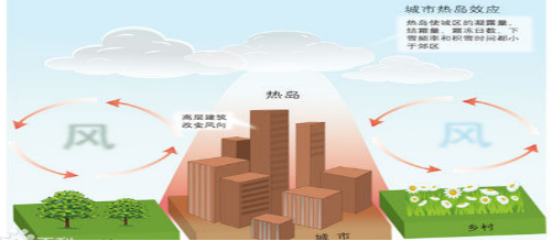 城市人口集中,工業發達,交通擁塞,大氣污染嚴重,城市建筑大多為石材和混凝土,其熱容量低,熱傳導率高,加上建筑物本身對風的阻擋或減弱作用,致城市年平均氣溫比郊區偏高(可高2℃以上),在溫度的空間分布上, 城市猶如一個溫暖的島嶼。