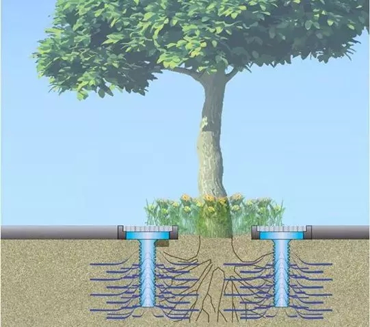 樹池的標高一般比路面低一些,用以收集、初步過濾雨水徑流。就行道樹而言,一系列連貫的樹池可以被設計成潛在的收水裝置,最大限度地發(fā)揮收集、過濾雨水徑流的作用。