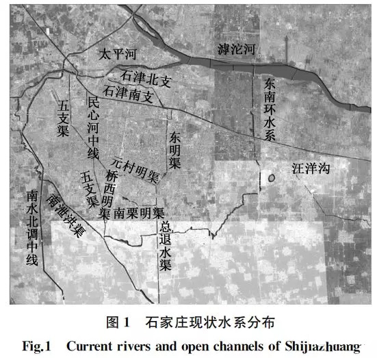 石家莊市區內河以民心河與東南環水系為主。民心河是基于1954~1982年建設的農灌與排澇渠道修繕聯通形成的明渠水系,主要包括總退水渠、元村明渠、南栗明渠、橋西明渠、東明渠、五支渠等;東南環水系則為2010年石家莊開始建設的集防洪排澇、生態景觀等功能為一體的環城水系長廊。石家莊現狀水系分布見圖1。