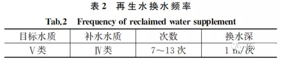 (1)換水法。通過周期換水是確保河道納污能力,水質穩定主要措施。根據納污能力(自凈能力)確定換水量是較為合理的水體補水量計算方法。實際工程中,多利用已有研究簡化計算步驟,直接確定換水頻次。如根據《城市污水再生利用景觀用水水質》(GB/T 18921-2002),完全使用再生水的河道水力停留時間宜在5 d之內,根據與石家莊狀況類似的《北京市水資源綜合規劃》的研究成果,利用再生水維持目標水質的換水頻率如表2所示。