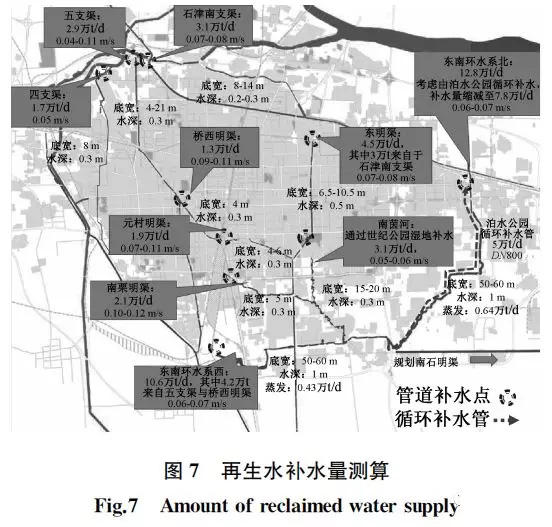 根據確定的邊界條件,以及補水點的布置,最終確定各渠道補水量如圖7所示,總補水量31.8萬t/d。其中東南環水系北補水量較大,考慮到其下游泊水公園面積較大,是石家莊重要的郊野濕地公園,調蓄容積大,且具有較好水體凈化能力。根據全市再生水平衡情況,為保障工業以及城市雜用等再生水需求,規劃利用泊水公園進行循環補水,可將東南環北補水點再生水補水量由12.8萬t/d減小到7.8萬t/d。