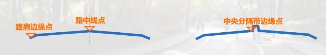 最后一個為了讓超高計算更加清晰,還需要明確橫斷面上的幾個代表點,以道路左轉為例。有左側也就是內側路肩邊緣、內側路面邊緣、路中、和右側也就是外側路面邊緣、路肩邊緣這五個代表點。道路右轉同理。