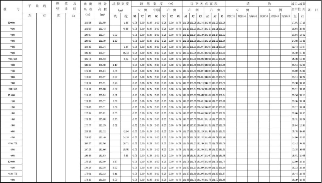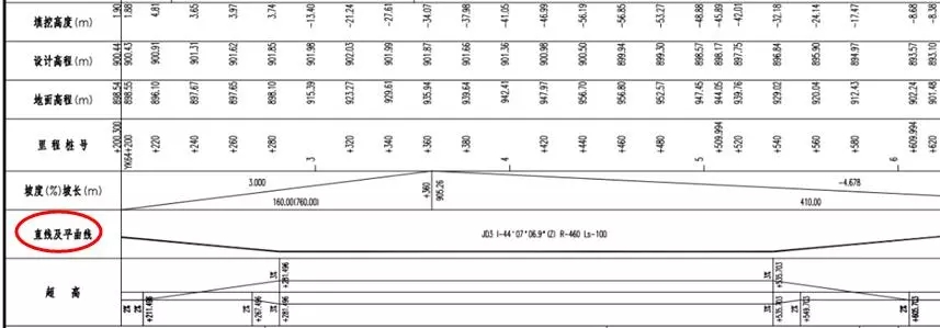 路基設計表:為便于施工,平曲線設計超高后,道路中線和內、外側(路肩)邊緣線與設計高程之差應列于路基設計表中。計算時需要按照超高過渡段、全超高段分別計算中線、內緣及外緣的高程。