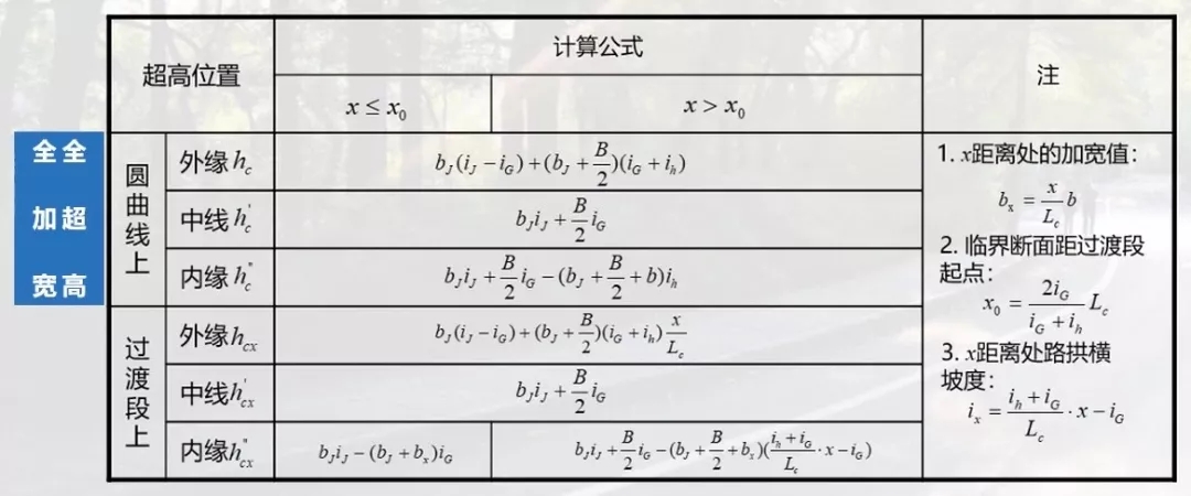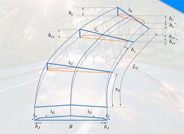 雖然超高計算圖示里有很多參數,但是大家需要了解其中三個重要的參數,分別是ix(x距離處路拱橫坡度)、bx(x距離處路基加寬值)和x0(與路拱同坡度的單向超高點到超高過渡段起點距離)。