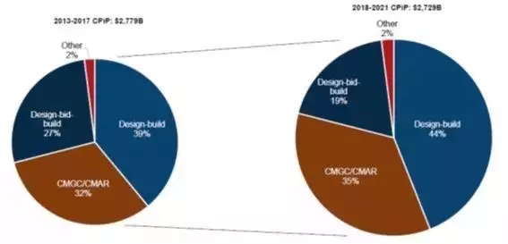 在美國工程建設(shè)市場上,主要存在三種工程建設(shè)模式:DBB 模式(DESIGN-BID-BUILD,類似于我國傳統(tǒng)工程建設(shè)模式)、CMGC/AR 模式(承包商介入工程設(shè)計(jì)階段,類似于分階段工程總承包模式)、DB 模式(DESIGN-BUILD,由一個(gè)承包商負(fù)責(zé)全部設(shè)計(jì)和施工,類似于全過程工程總承包模式)。根據(jù)美國設(shè)計(jì)建造學(xué)會(huì)和 FMI 咨詢公司的研究,2013 年到 2017 年期間,美國工程建設(shè)市場上 DB 模式占比最高,達(dá) 39%;2018 年到 2021 年的預(yù)測表明,DB 模式占比將進(jìn)一步擴(kuò)大,達(dá)到 44%。因此,在美國工程建設(shè)市場上,全過程工程總承包模式由于具備工期短、變更少、業(yè)主可控性高等優(yōu)勢,成為最重要的工程建設(shè)模式。