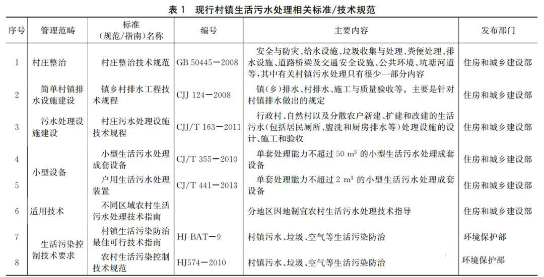 村鎮污水處理技術相關標準的制定,對規范整個行業的技術發展起著重要作用。從2008年以來,住建和環保等部門相繼發布了一系列村鎮生活污水處理技術標準指南指導建設工作,如表1所示。以上標準的出臺對于規范管理村鎮污水處理設施的建設起到了一定的作用。