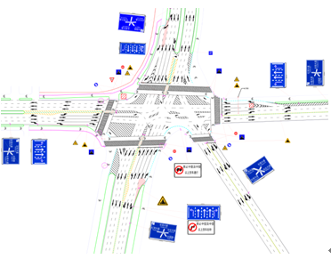 為了減少右轉(zhuǎn)車輛與非機(jī)動(dòng)車和行人的相互沖突,保證非機(jī)動(dòng)車和行人安全順利過(guò)街。優(yōu)化設(shè)計(jì)方案中各路口均增設(shè)行人讓行標(biāo)志標(biāo)牌以及各類護(hù)欄。同時(shí),為了保證車輛進(jìn)入交叉口前獲得道路信息和行車信息各路口增設(shè)了行車道指示牌和道路指示牌。