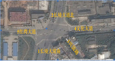 該交叉口位于江西省南昌市新建區(qū)中心城區(qū)西部。由長(zhǎng)堎大道、紅灣大道、文化大道、興國(guó)路五路交叉組成。其中長(zhǎng)堎大道南北方向雙向六車道主干道,紅灣大道、文化大道是連接新建區(qū)和灣里區(qū)的主要交通干道,興國(guó)路連接新建區(qū)中心城區(qū)并設(shè)有多條公交線路。該交叉處在新建區(qū)大力開(kāi)發(fā)地段,周邊居民區(qū)密集、各道路沿途設(shè)有多家商業(yè)和購(gòu)物中心,并輻射周邊的高校園區(qū)和工業(yè)園區(qū)。由于交叉口交通流量較大、多路相交,加上長(zhǎng)堎大道建成通車后未能對(duì)交叉口各進(jìn)出口道和內(nèi)部空間進(jìn)行科學(xué)合理的交通渠化設(shè)計(jì),導(dǎo)致交通混行,交通擁堵現(xiàn)象經(jīng)常發(fā)生。交叉口現(xiàn)狀如圖-1所示。