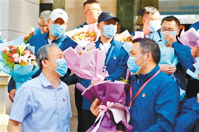 下午4點左右,29名珠峰高程測繪隊員們在大家翹首期盼下回到省測繪地理信息局。彼時,留守在“家”的戰友和家人們早已經在這里等候他們。短暫的歡迎儀式后,家人和朋友們擁抱和握手成為他們表達思念的方式。這29名測繪隊員不少人已經在珠峰待了兩三個月,有的甚至時間更長,回到西安讓他們感到格外親切。“我從過年前就去拉薩集訓了,有大半年時間都沒有見到孩子了。太想念家人,想念西安的肉夾饃、泡饃啦!”皮膚黝黑的測繪隊員邢雄旺說。