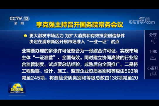 國務(wù)院總理李克強(qiáng)11月11日主持召開國務(wù)院常務(wù)會議,聽取國務(wù)院第七次大督查情況匯報(bào),確保政策落實(shí),更好發(fā)揮促進(jìn)經(jīng)濟(jì)穩(wěn)定恢復(fù)的重要作用;決定在浦東新區(qū)開展市場準(zhǔn)入“一業(yè)一證”試點(diǎn),在全國大幅壓減建設(shè)工程企業(yè)和測繪資質(zhì)并加強(qiáng)監(jiān)管,更大激發(fā)市場活力,為擴(kuò)大消費(fèi)和有效投資創(chuàng)造條件。