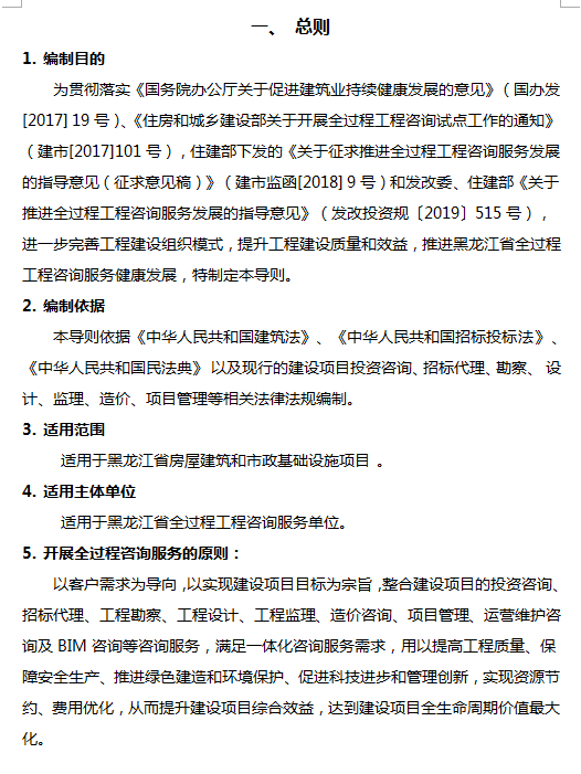 為貫徹落實《國務院辦公廳關于促進建筑業持續健康發展的意見》(國辦發[2017]19號)、《住房和城鄉建設部關于開展全過程工程咨詢試點工作的通知》(建市[2017]101號),住建部下發的《關于征求推進全過程工程咨詢服務發展的指導意見(征求意見稿)》(建市監函[2018]9號)和發改委、住建部《關于推進全過程工程咨詢服務發展的指導意見》(發改投資規〔2019〕515號),進一步完善工程建設組織模式,提升工程建設質量和效益,推進黑龍江省全過程工程咨詢服務健康發展,特制定本導則。