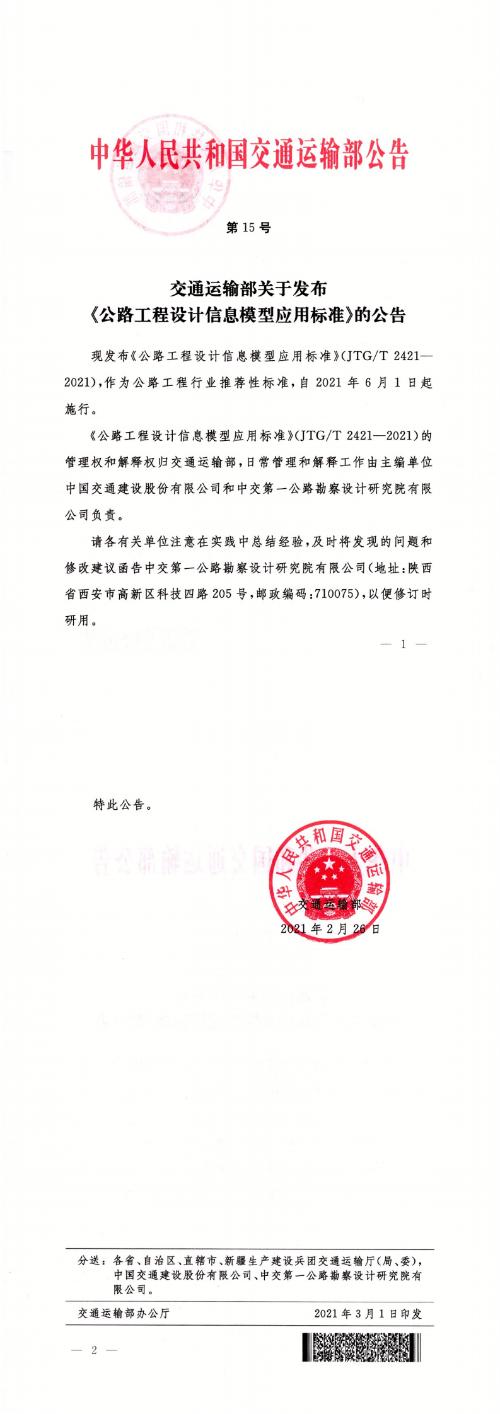 運輸部關于發(fā)布《公路工程設計信息模型應用標準的公告》
