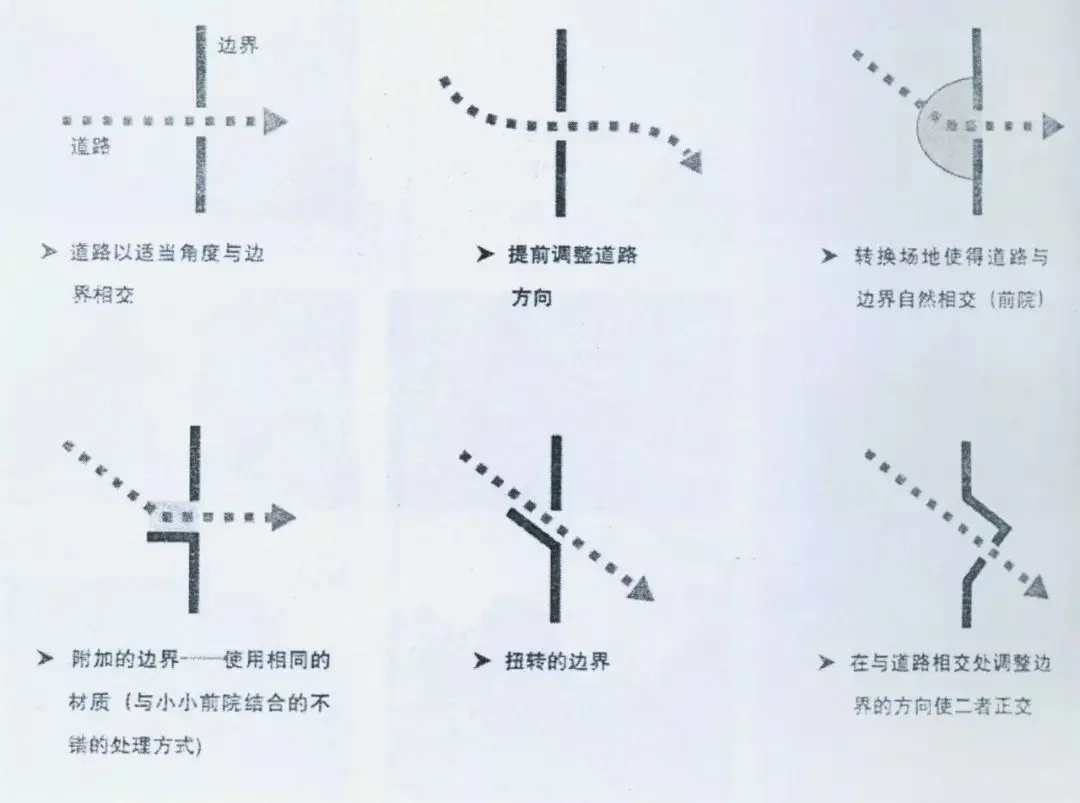道路與邊界應(yīng)讀以適當(dāng)?shù)慕嵌认嘟弧H绻缆沸枰D(zhuǎn)一定方向與邊界相交,可以提前做適當(dāng)?shù)奶幚怼0ㄌ崆罢{(diào)整道路的角度,在邊界前留出一塊轉(zhuǎn)換空地或者使得邊界與道路的方向相呼應(yīng)。