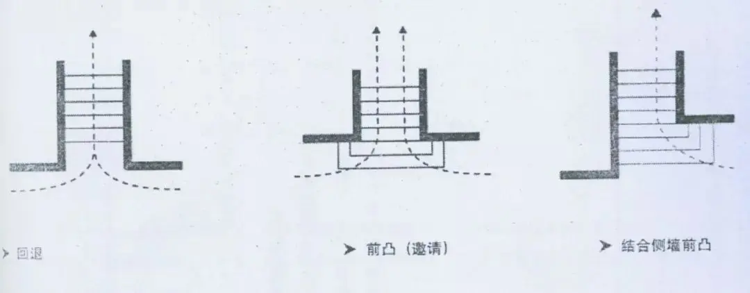 臺(tái)階以為著強(qiáng)烈的指向。在臺(tái)階上下的區(qū)域應(yīng)當(dāng)做特殊處理以表明方向的改變。因此,建筑邊沿的臺(tái)階應(yīng)當(dāng)向前延伸(公共性、邀請(qǐng)感)或者向后退縮(私密性、限制感),其他景觀看見(jiàn)宜同。