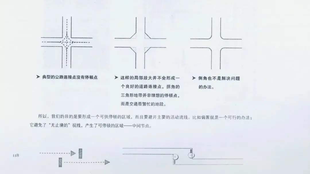 所以,我們的目的是要形成一個(gè)可供停頓的區(qū)域,而且要避開(kāi)主要的活動(dòng)流線。比如偏置就是一個(gè)可行的辦法;它避免了“無(wú)止境的”視線,產(chǎn)生了可停頓的區(qū)域——中間節(jié)點(diǎn)。