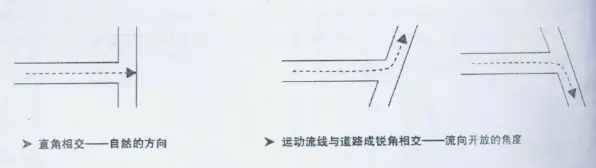 如果運(yùn)動(dòng)流線與線性構(gòu)筑物(道路,空間邊界等)相交角不是自然的正交,運(yùn)動(dòng)流線就會(huì)自動(dòng)導(dǎo)向開(kāi)放的“鈍角”一側(cè)。