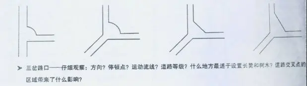 道路連接點(diǎn)與公路連接點(diǎn)不同,需要一些停頓區(qū)域。使用者在此稍作停頓,觀察選擇自己的運(yùn)動(dòng)方向。因此,連接點(diǎn)需要在交叉路口加寬,有足夠的空間。但是僅僅加寬道路并不會(huì)自動(dòng)產(chǎn)生一個(gè)宜人的道路連接點(diǎn)。