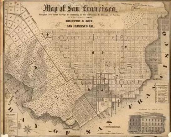 1811年曼哈頓專員的計劃試圖建立一個嚴格的街道網(wǎng)格,以發(fā)展島上的其他地區(qū)。幾十年后,這幅1852年的地圖顯示舊金山也做了同樣的事情,為了出于方便忽略了這個城市不規(guī)則的海岸線和地形。
