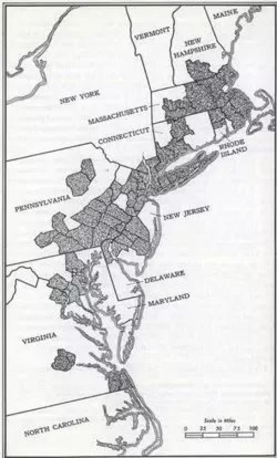 如今,規(guī)劃人員越來越多地談?wù)撆c交通、經(jīng)濟和環(huán)境有關(guān)的問題,而在規(guī)模上脫離了社區(qū)和城市,整個地區(qū)被多個地鐵連接在一起。不過,“大都市圈”的概念并不新鮮。這張1961年吉恩·戈特曼所著《大都市》一書中的地圖,展示了華盛頓特區(qū)東北部到波士頓一個連綿不斷的超大區(qū)。
