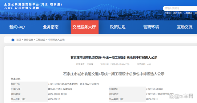 石家莊市城市軌道交通4號線一期工程設(shè)計總承包中標候選人公示