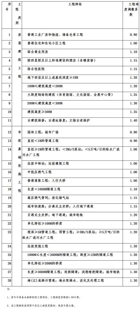 工程復(fù)雜程度分為一般、較復(fù)雜和復(fù)雜三個(gè)等級,其調(diào)整系數(shù)分別為:一般(Ⅰ級)0.85;較復(fù)雜(Ⅱ級)1.0;復(fù)雜(Ⅲ級)1.15。