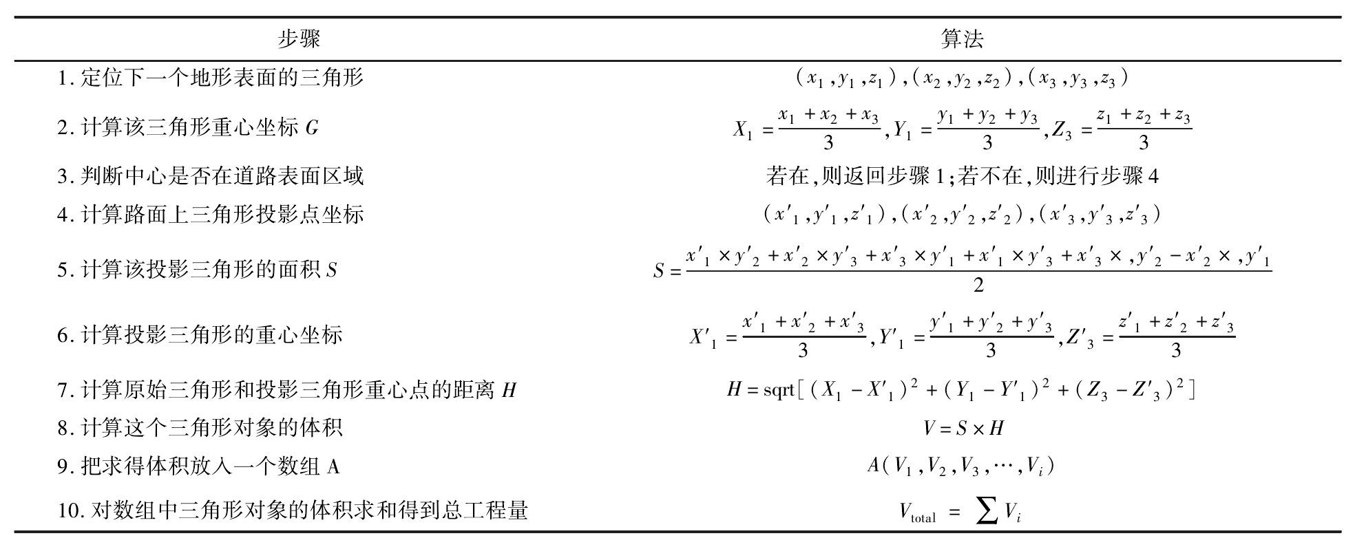 數字高程模型(DEM)是用一組有序數值陣列形式表示地面高程的實體地面模型[1]。利用DEM法對土方量進行計算實質上是計算初始地面與設計地面之間的體積差值,通過Civil 3D運用此方法將道路模型曲面與原有地形曲面相比較來計算土方量,和傳統方法相比,通過三維模式下兩個曲面的比較則更為準確。計算的具體步驟見表1。