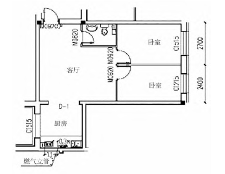 在室內(nèi)鋪設(shè)燃?xì)夤芫€時(shí),必須注意:①不能鋪設(shè)在潮濕或含有腐蝕性介質(zhì)的房間,也不能將其引入臥室,特別是在臥室、浴室或衛(wèi)生間里;②嚴(yán)禁通過(guò)易燃、爆炸物品、配電間、變電所、煙、風(fēng)道等場(chǎng)所;③橫穿臥房、衛(wèi)生間或地下室的管道,應(yīng)在套管內(nèi)安裝焊接;④如需放置于潮濕或有腐蝕性介質(zhì)的室內(nèi),則應(yīng)采用防腐蝕措施;⑤管道穿越樓板、樓梯平臺(tái)、墻壁、隔墻時(shí),應(yīng)將管線置于套管內(nèi)。⑥安裝燃?xì)庠畹姆块g凈高不宜低于2.2米,安裝熱水器的房間應(yīng)該宜大于2.4米。如圖3所示,室內(nèi)廚房豎管的設(shè)計(jì)。