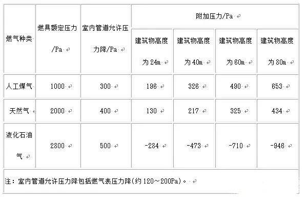 燃氣種類 燃具額定壓力/Pa 室內(nèi)管道允許壓力降/Pa 附加壓力/Pa 建筑物高度為24m 建筑物高度為40m 建筑物高度為60m 建筑物高度為80m 人工煤氣 1000 300 196 326 490 653 天然氣 2000 400 130 217 325 434 液化石油氣 2800 500 -284 -473 -710 -946 注:室內(nèi)管道允許壓力降包括燃氣表壓力降(約120~200Pa)。