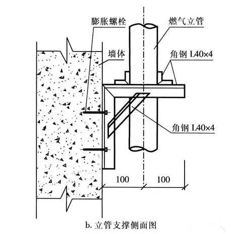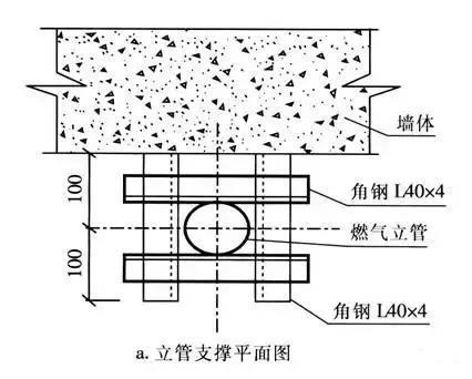 隨著建筑物層數(shù)的增加,燃氣立管的長度也變長,管道的自重變大,所以應(yīng)設(shè)置管道的固定支架,使固定支架與建筑物成為一體,防止因管道下沉而引起引入管受力折斷或變形引起倒坡。一般固定管道的做法有: