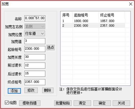 緯地軟件實(shí)現(xiàn)任意復(fù)雜線形設(shè)計(jì)3、批量設(shè)計(jì)錯車道和斷面寬度變化針對低等級公路需要添加的錯車道數(shù)量較多或者設(shè)置護(hù)欄時土路肩需要加寬的情況,緯地軟件增加了快速加寬設(shè)計(jì)功能。可根據(jù)加寬需求設(shè)置加寬名稱、加寬位置(含行車道、硬路肩、土路肩)、加寬值、加寬起終點(diǎn)樁號、加寬長度、過渡段長度等參數(shù),也可直接提取該項(xiàng)目的擋墻設(shè)置段落進(jìn)行加寬設(shè)計(jì)。