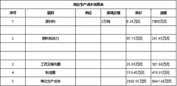 1)單位生產成本的估算,序號項目規(guī)格單位消耗定額單位金額