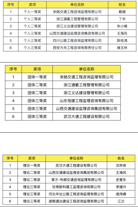競賽現(xiàn)場賽程緊湊,氣氛緊張,選手靈活運用自己的經(jīng)驗和技能,尋找現(xiàn)場存在的質(zhì)量安全問題。經(jīng)過一天的激烈角逐,裁判組綜合研判,評定出個人、團體、理論獎項如下圖,另有60名選手獲得優(yōu)勝獎,其中浙江選手包攬個人和團體前三名。