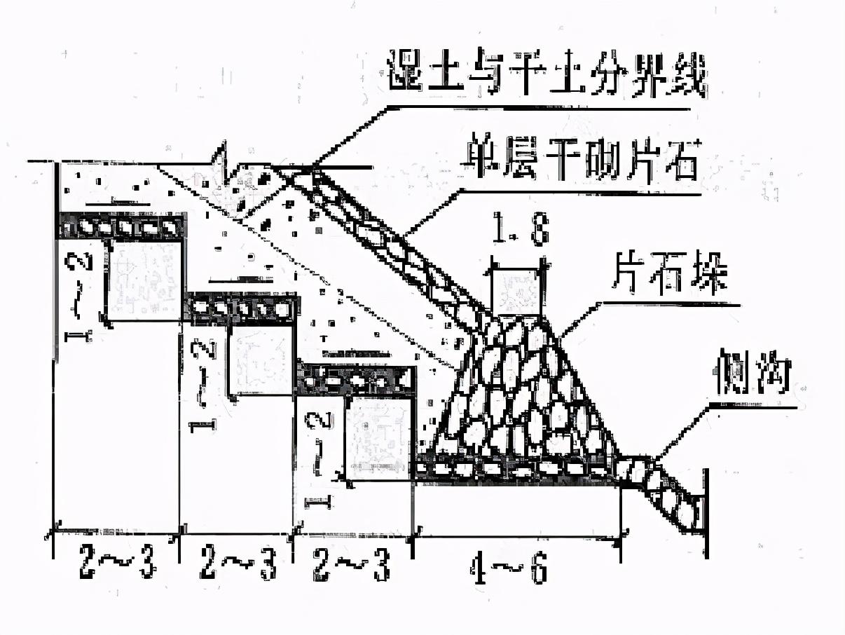 - 防滲的方法:表層夯拍,三合土、四合土捶面,漿砌片石護面及用混凝土水槽等,對于采用卵石護面或干砌片石護面的水溝,也可在其底層用粘土夯鋪一層厚0.2~0.3m的土層;