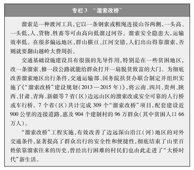 解決特殊地區出行難題。改一條溜索、修一段公路就能給群眾打開一扇脫貧致富的大門。為了保障偏遠山區百姓安全出行,推動“溜索改橋”建設,專項資金支持、精心組織實施,用3年時間徹底改善了溜索地區出行條件(專欄3)。推進“直過民族”③和人口較少民族聚居區農村公路建設,解決民族地區交通閉塞的突出問題,加快民族地區脫貧致富步伐。