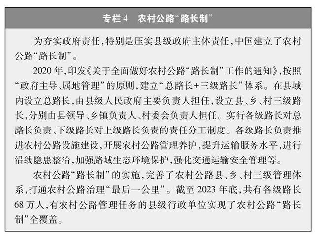 完善政策制度。出臺《關于推動“四好農村路”高質量發展的指導意見》等20余項政策文件,建立覆蓋體制、機制、組織、監管、資金、考核、服務等領域的農村公路政策制度體系。把責任制作為管理的重中之重,出臺《關于深化農村公路管理養護體制改革的意見》,確立省、市級政府加強統籌和指導監督、縣級政府履行主體責任,建立縣級相關部門、鄉級政府農村公路管理養護權力和責任清單,形成上下聯動、密切配合、齊抓共管的工作局面。建立農村公路“路長制”(專欄4),由縣、鄉兩級行政負責人和村(居)委員會負責人擔任路長,實現跨部門協同,推動政府主體責任高效落實,使農村公路管理逐步從粗放向精準、從被動向主動、從單打獨斗向齊心協力轉變。