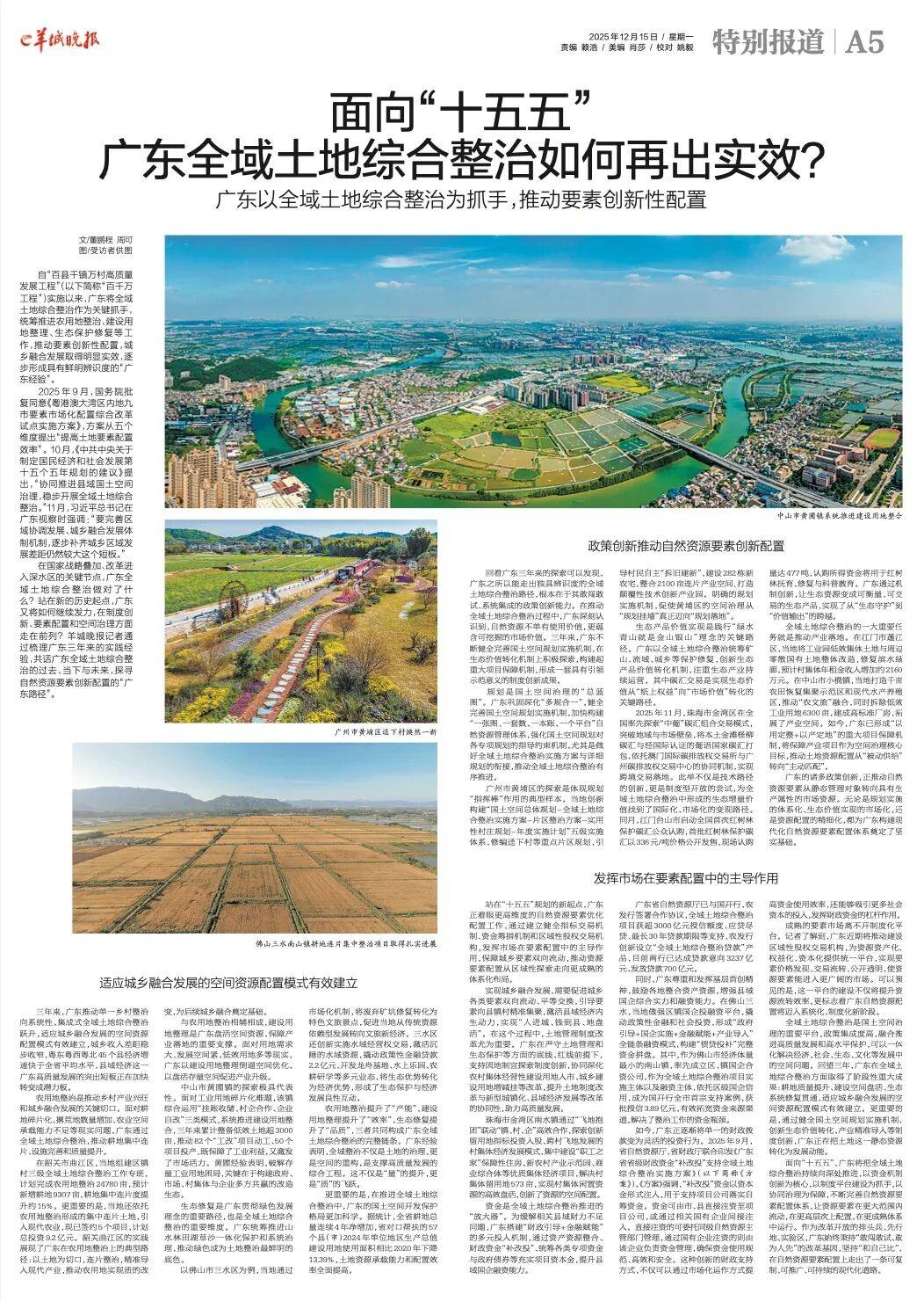 站在“十五五”規劃的新起點,廣東正著眼更高維度的自然資源要素優化配置工作,通過建立健全指標交易機制、資金籌措機制和區域性股權交易機構,發揮市場在要素配置中的主導作用,保障城鄉要素雙向流動,推動資源要素配置從區域性探索走向更成熟的體系化布局。